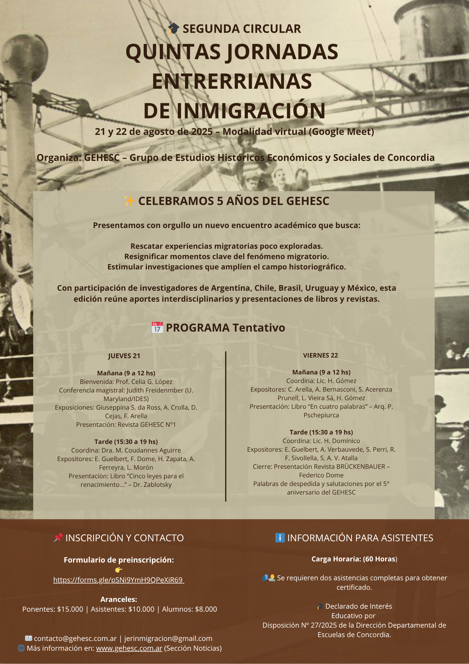 La FHUC de la UNL, declaró DE INTERÉS INSTITUCIONAL a las Quintas Jornadas Entrerrianas de Inmigración, mediante Resolución Nª 411/25. En sus considerandos destaca el carácter argentino y latinoamericano del GEHESC, la calidad de sus intervenciones y la proyección de las mismas.