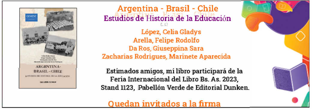 El día 9 del corriente, a las 18 hs. el Lic. Felipe Arella y la Prof. Celia G. López firmaron ejemplares del libro ARGENTINA- BRASIL- Chile: Estudios de Historia de la Educación, recientemente publicado por el GEHESC, en el Stand de EDITORIAL DUNKEN de la Feria Internacional del Libro. La obra integra los trabajos de los mencionados autores junto a Giuseppina Sara da Ros, por Chile y Marinete Zacharías Rodríguez por Brasil.
